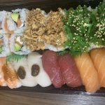 22,90€PARTY FOUR 20PIEZAS2 nigiri salmon 2 nigiri atún 2nigiri pez escola negra 2 nigiri langostino 4 salmón uramaki 4 wakame salmon roll 4 crunch salmon roll